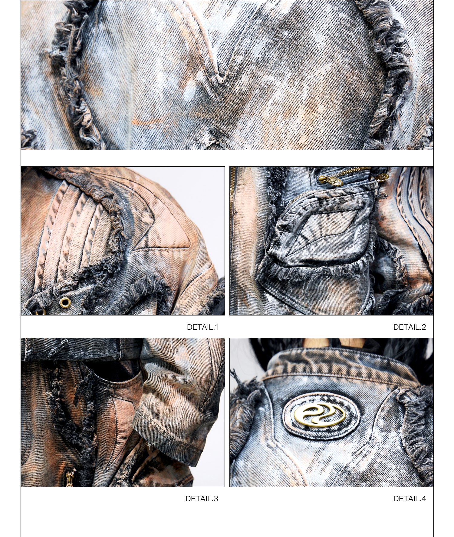 グラフィティ風プリントと酸化フェード加工を施したデニムジャケット。