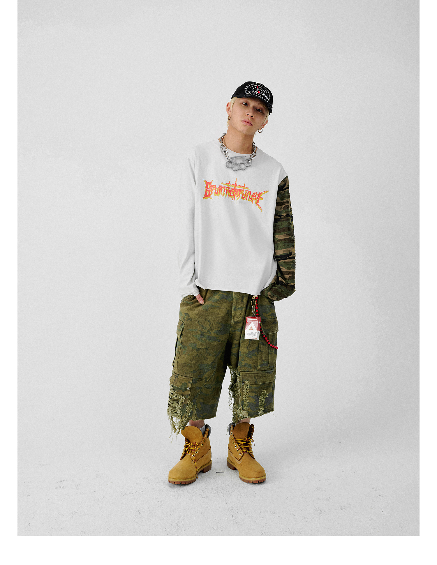 迷彩スプライスとクラックプリントを施したダメージ加工風ロングTシャツ。