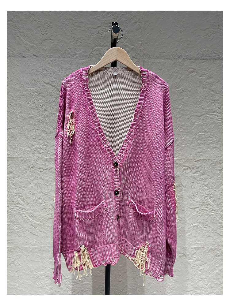 ・クランベリーピンクのタイダイ加工を施したニットカーディガン。